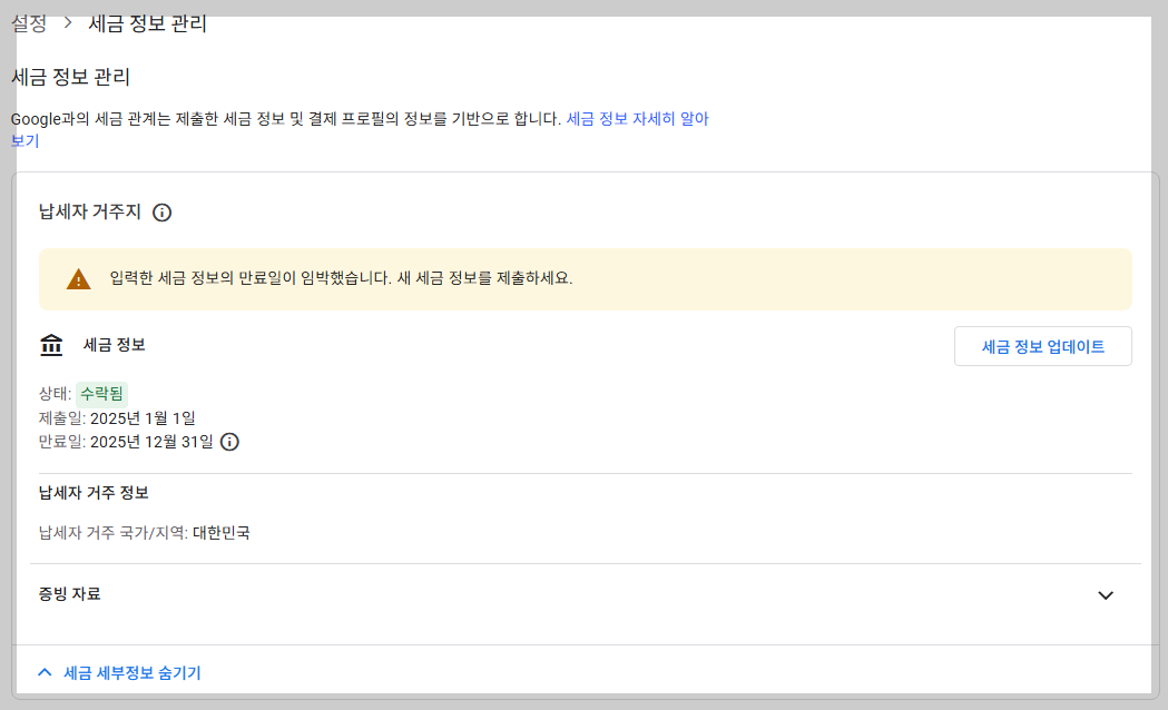 "세금 정보 관리" 화면으로 전환이 되었어요.